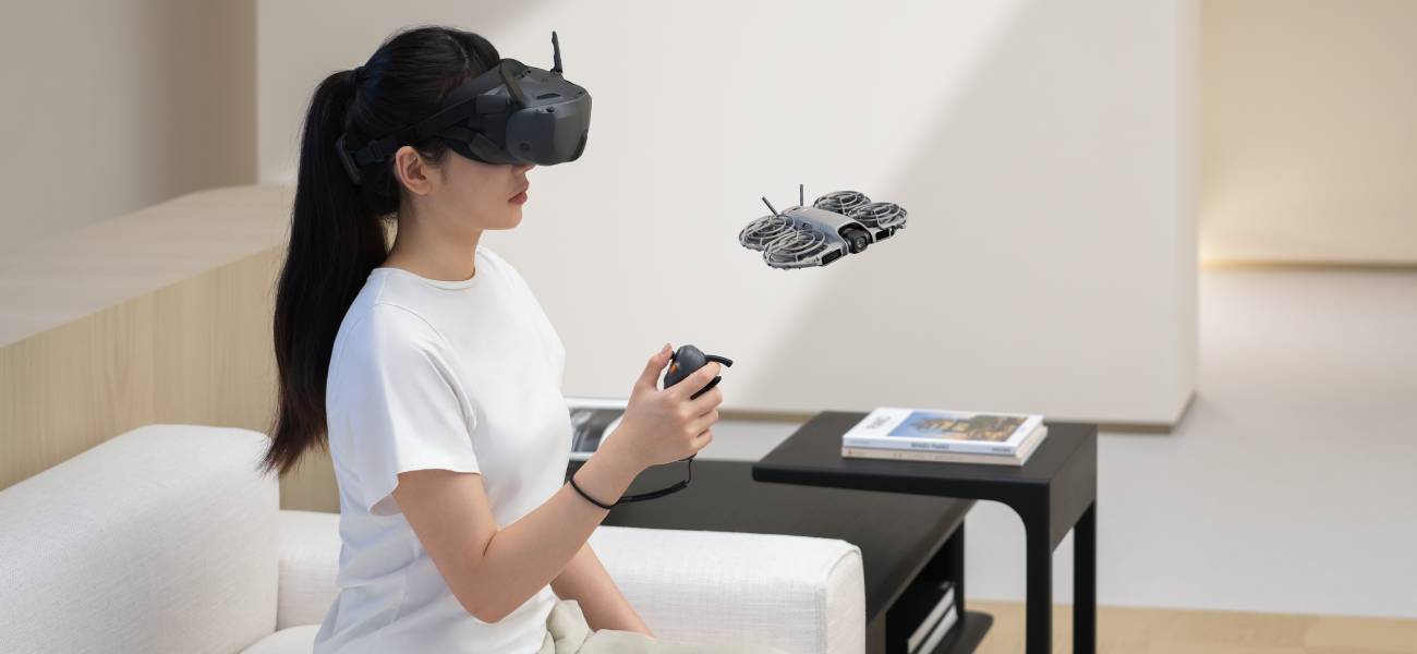 Jednym z największych atutów zestawu jest kontroler ruchowy DJI Motion 3 Controller, który umożliwia sterowanie dronem za pomocą naturalnych ruchów dłoni. Dzięki temu pilotowanie staje się bardziej intuicyjne i przypomina sterowanie w trybie FPV. Takie rozwiązanie pozwala uzyskać bardziej dynamiczne i płynne ujęcia, szczególnie podczas nagrywania scen akcji czy sportów. Kontroler reaguje na ruchy użytkownika w czasie rzeczywistym, co zapewnia precyzyjne manewrowanie dronem. Dron został wyposażony w kompleksowy system wykrywania przeszkód działający w wielu kierunkach. Technologia omnidirectional sensing wykorzystuje zestaw czujników, kamer oraz elementów podczerwieni, aby monitorować otoczenie podczas lotu. Dodatkową ochronę zapewniają osłony śmigieł, które zmniejszają ryzyko uszkodzenia urządzenia podczas lotów w ograniczonej przestrzeni. W sytuacji utraty sygnału lub niskiego poziomu baterii dron automatycznie uruchamia funkcję Return to Home i wraca do punktu startu.